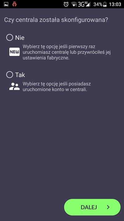 Na początku trzeba wybrać centralkę, która pojawi się na pierwszym ekranie konfiguracji. Wtedy smartfon lub tablet powinien połączyć się z urządzeniem i zapytać, czy jest to pierwsza konfiguracja, czy centralka była już ustawiana. W przypadku dodawania kolejnych użytkowników trzeba wybrać „Tak”, a w przypadku pierwszego startu „Nie”.